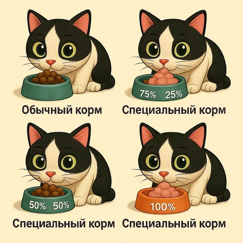 Реальность: Специализированные сухие диеты компенсируют это за счет состава, и многие кошки хорошо их переносят.