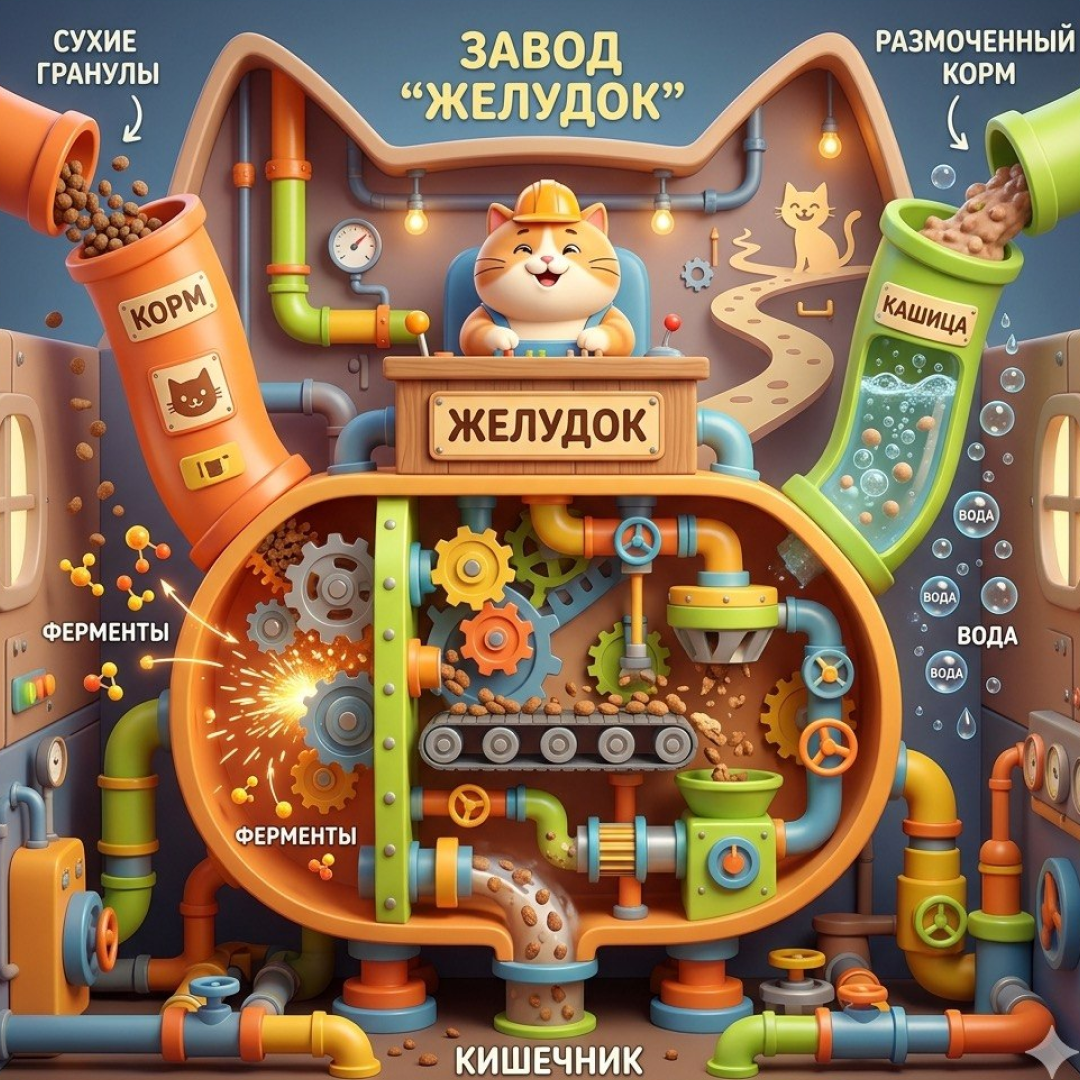 В желудке кошки всё устроено как в химическом реакторе. Там выделяется соляная кислота и ферменты, которые расщепляют белки и жиры. Твёрдая пища задерживается в желудке дольше, давая ферментам время на работу. Мягкая, размоченная — проходит быстрее.