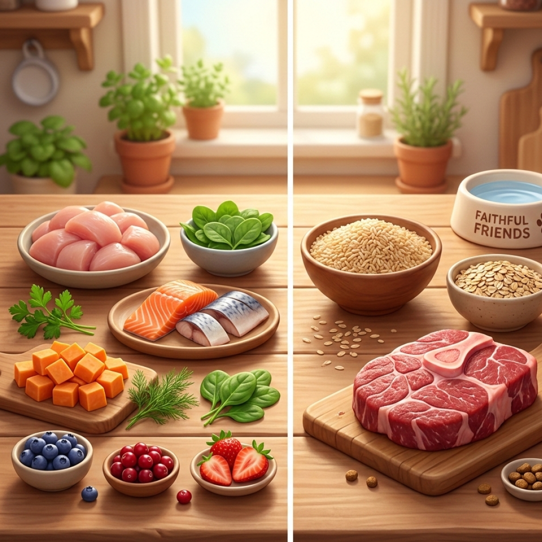 | Мясо | Чётко названное, качественное, дегидрированное или свежее. | Только сорта «для людей», часто свежее и целиковое. |